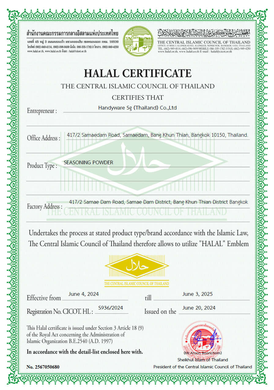 Handyware SG (Thailand) เป็นหนึ่งใน Handyware Group ที่ก่อตั้งขึ้นในปี พ.ศ. 2511 ปรัชญาของกลุ่ม “ผลิตภัณฑ์คุณภาพและบริการที่เป็นเลิศ” ฝังรากลึกอยู่ในกิจกรรมประจำวันของเราและได้การปรับปรุงอย่างต่อเมื่อเนื่องในช่วง ปีที่ผ่านมา จนถึงปัจจบนกลุ่มบริษัทมีบริษัทย่อยมากกว่า 13 แห่ง ใน ฟิลิปปินส์ เยอรมนี แอฟริกาใต้ ญี่ปุ่น สิงค์โปร์ ไทย ไนจีเรีย มาเลเซีย และ จีน ได้เติบโตขึ้นเป็นกลุ่มที่มีความหลากหลายโดยมีส่วนร่วมใน เครื่องปรุงรสอาหาร เนื้อจากพืช เครื่องจักรอิงค์เจ็ต น้ำหอม กลิ่นบุหรี่ไฟฟ้า และ ธุรกิจกิจที่มุ่งเน้นการเติบโตอื่นๆ